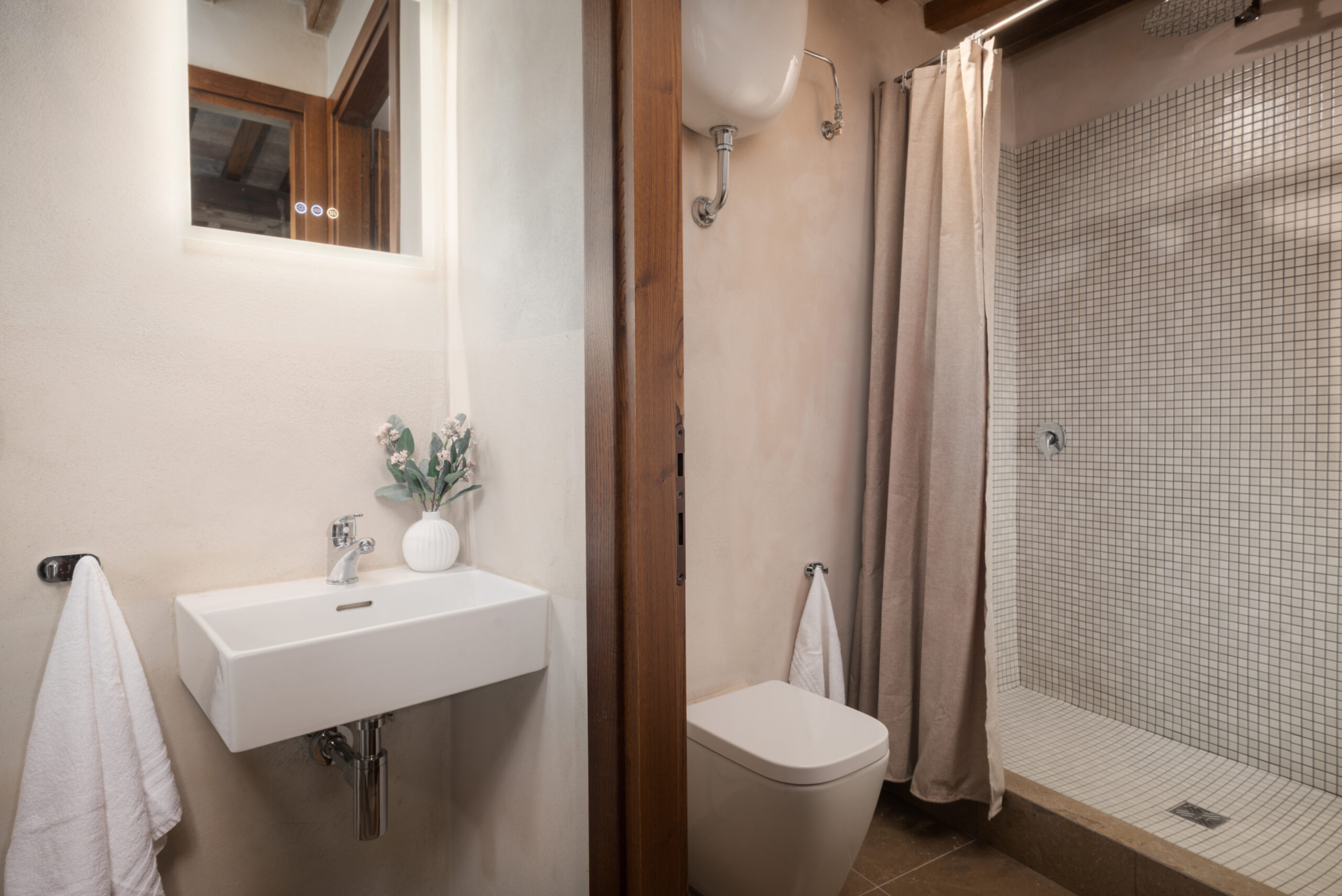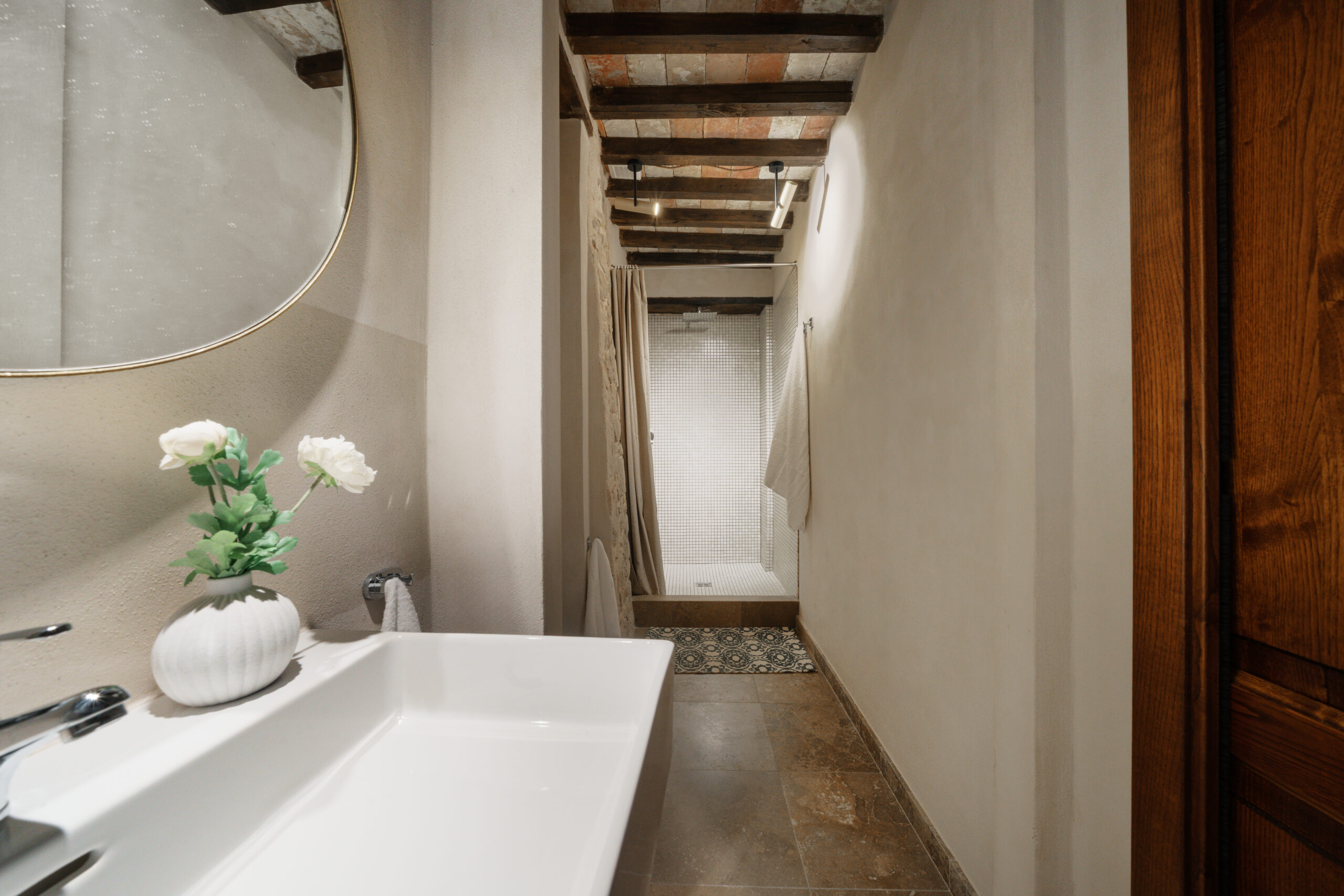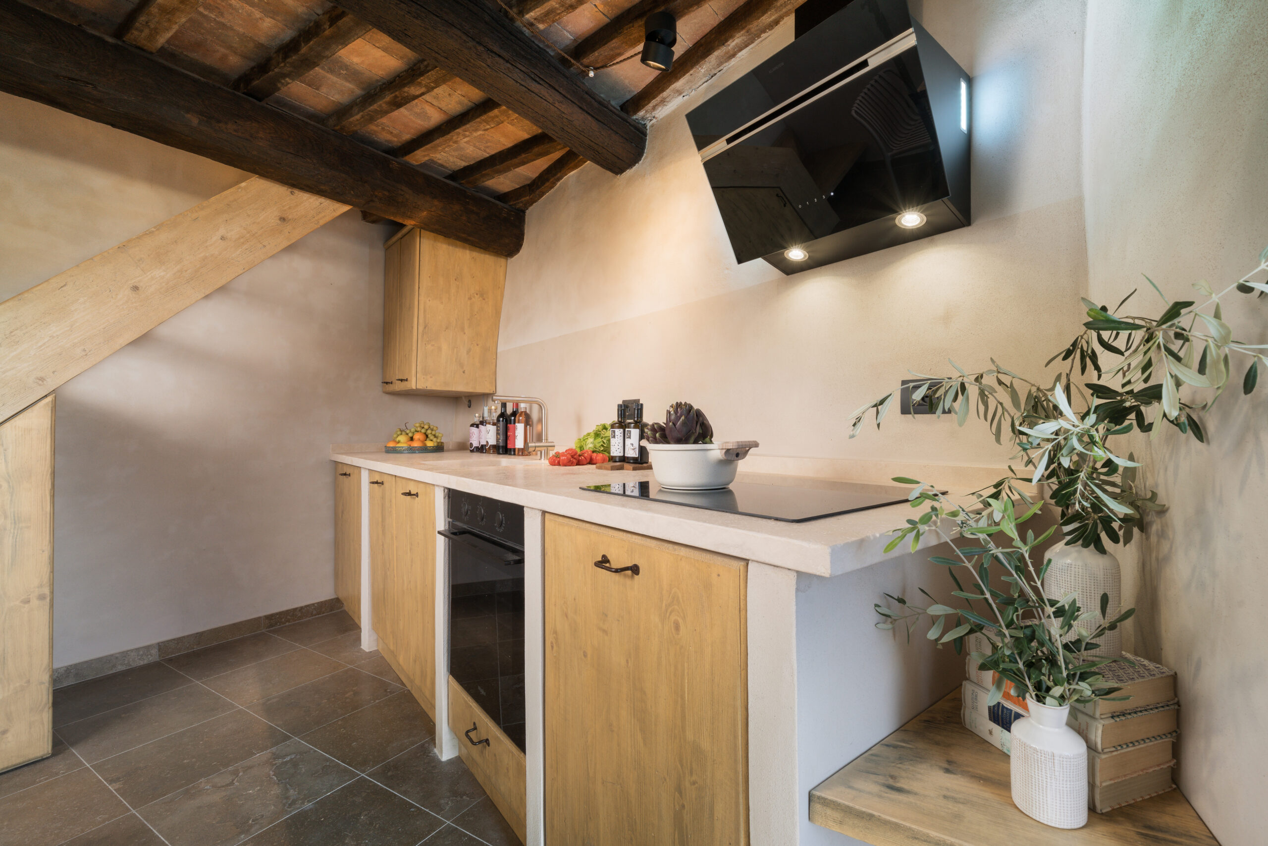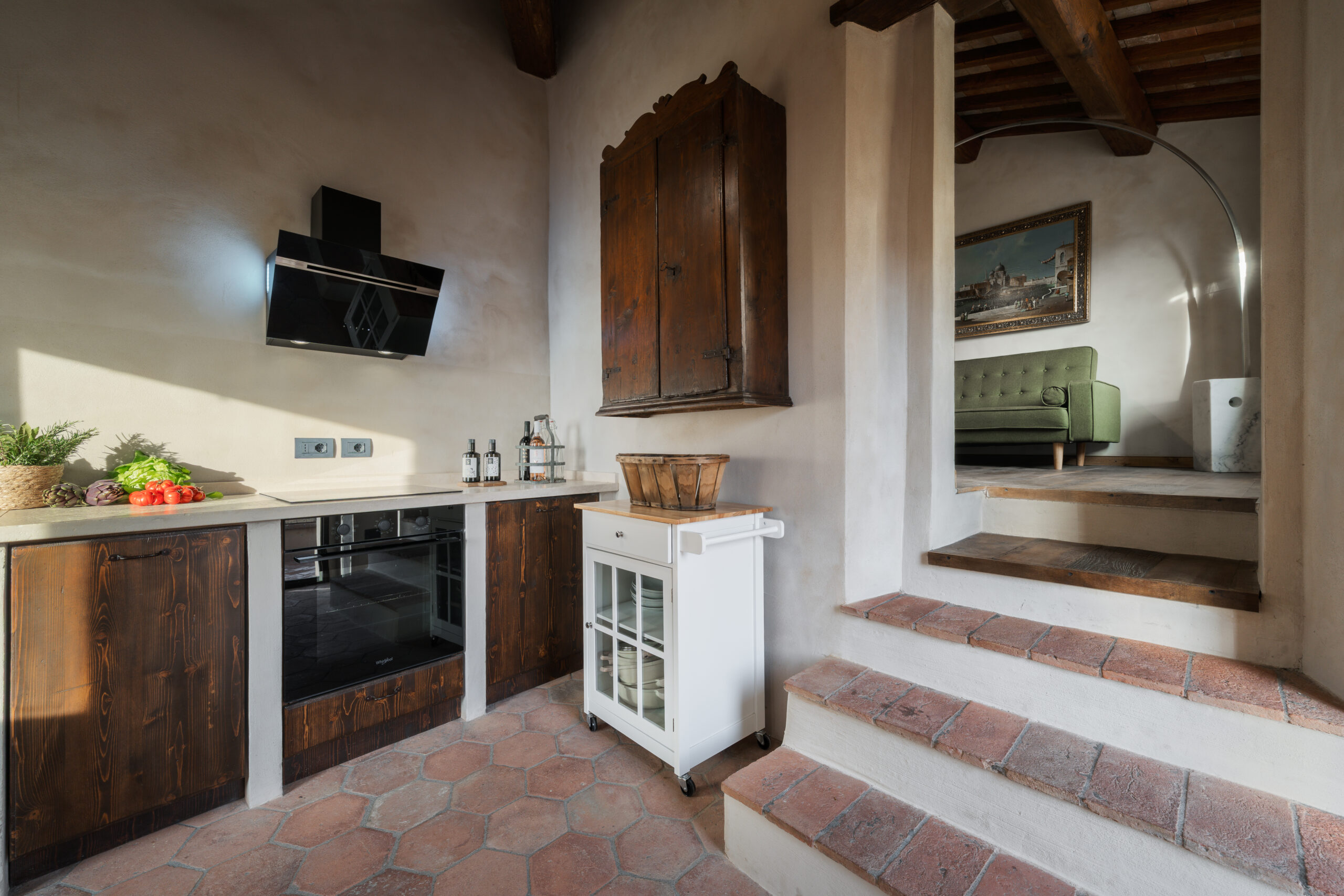 L’appartamento combina comfort moderno e fascino storico: la cucina è piccola ma raffinata e completamente attrezzata con elettrodomestici contemporanei, mentre la zona giorno, con pavimento in legno di oltre 500 anni e soffitto con travi e vecchie tegole, è accogliente e decorata con opere d’arte. La camera matrimoniale, con testata in legno dipinta a mano e vista sulla piazzetta del borgo, offre un’atmosfera calda e armoniosa, mentre il bagno, con travertino toscano e doccia incastonata nelle mura medievali, completa l’appartamento con sobria eleganza.