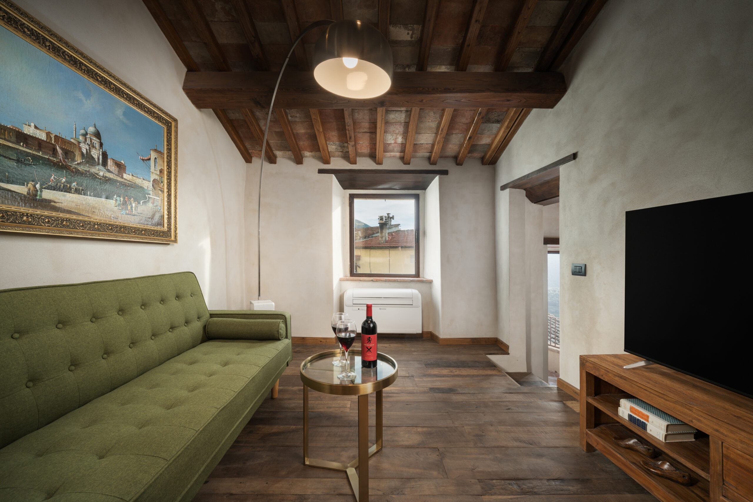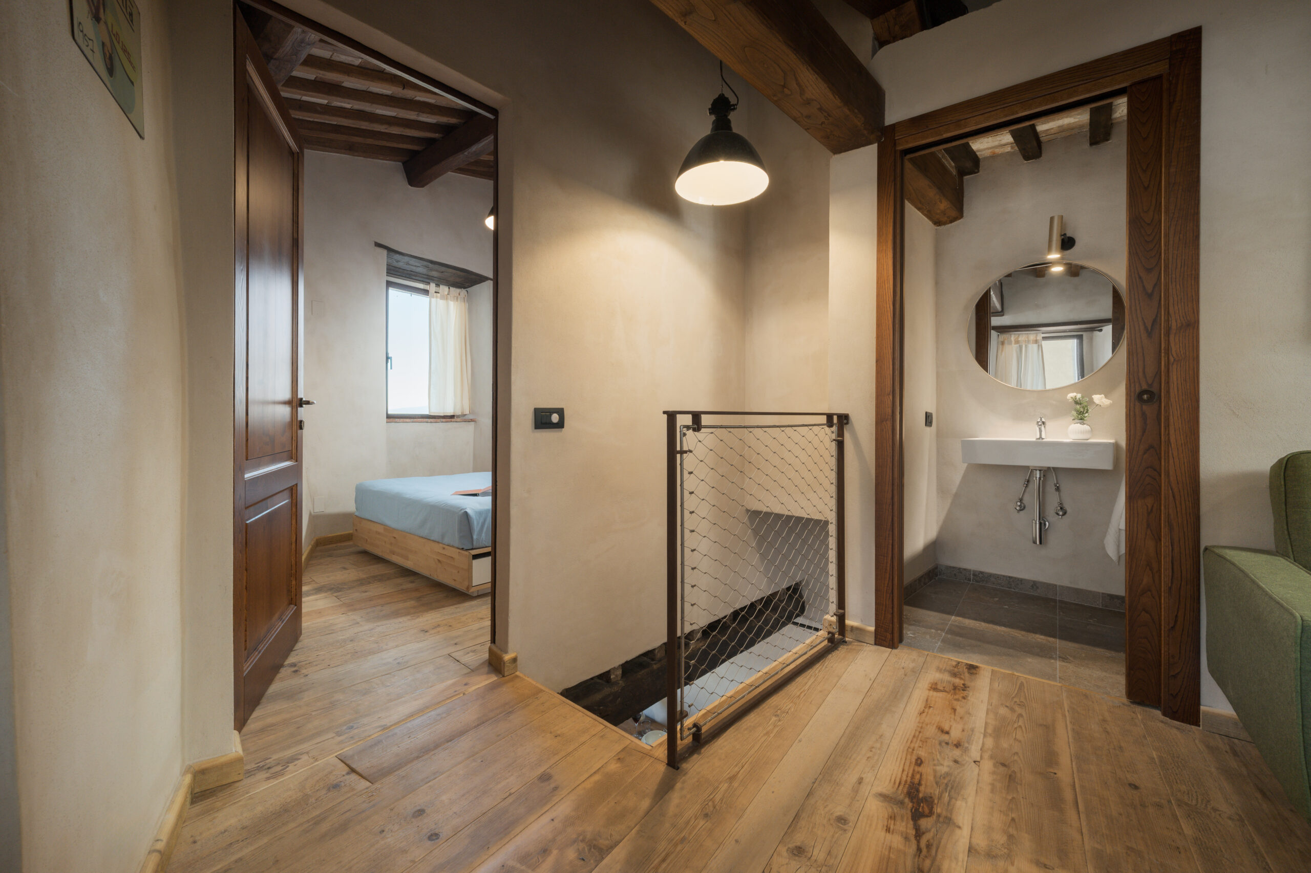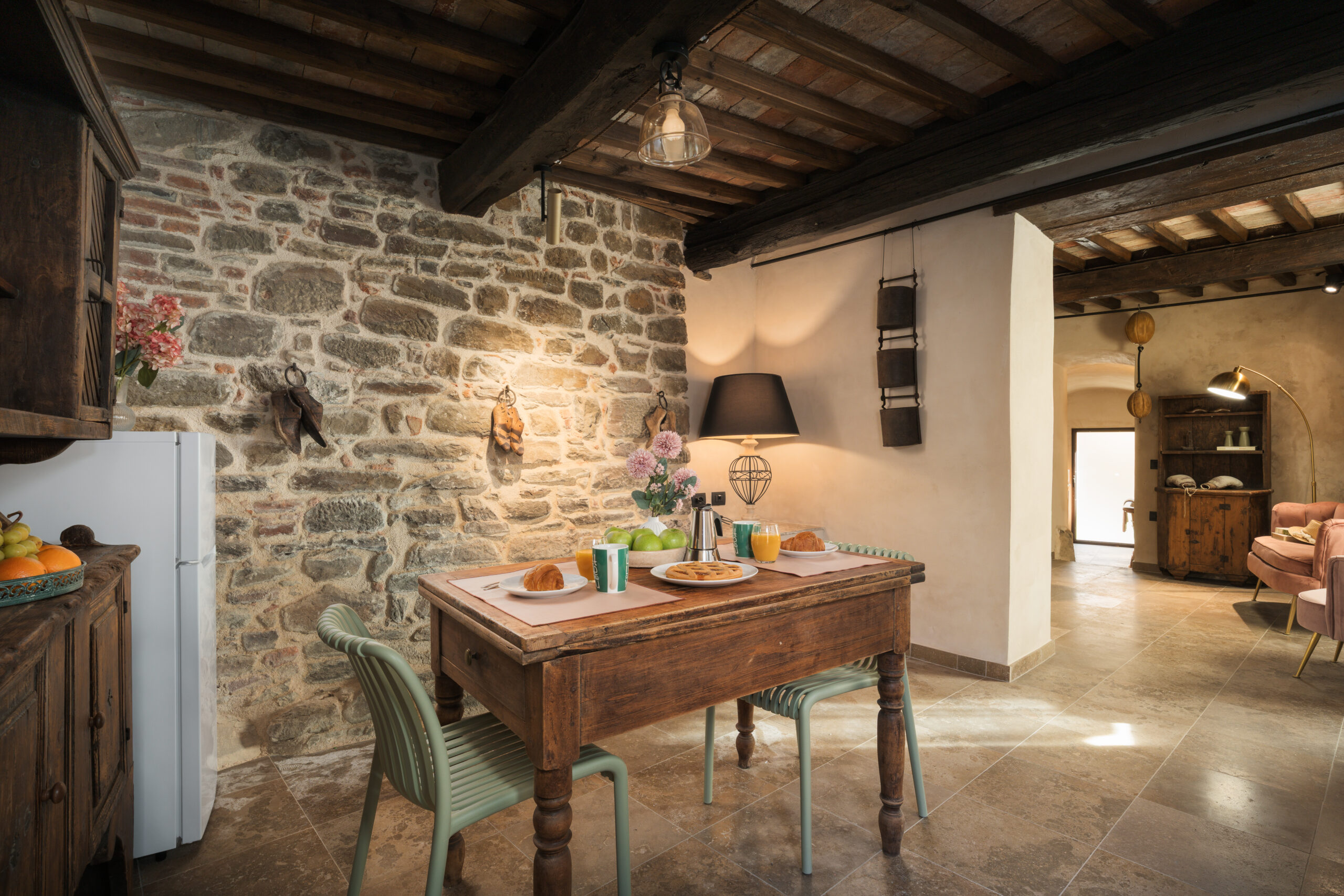 Ogni appartamento è stato ristrutturato utilizzando materiali antichi e di alta qualità, scelti per preservare l’anima originaria dell’edificio: pietra locale, travi in legno a vista, pavimenti in cotto antico fatto a mano e dettagli artigianali che raccontano secoli di storia.