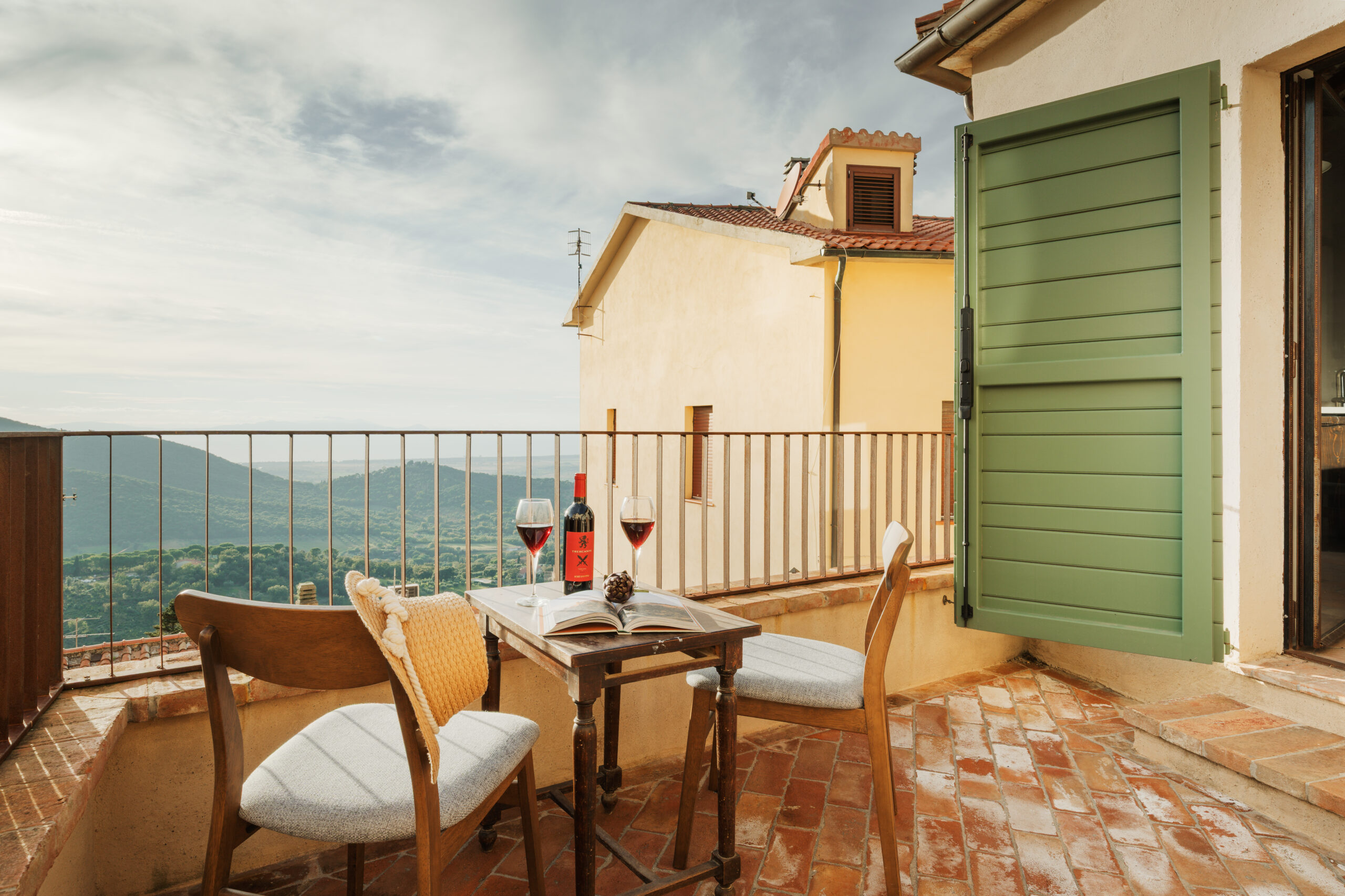 L’appartamento combina eleganza artigianale e comfort moderno: la cucina raffinata, con pavimento in travertino e tavolo d’epoca “a tiro”, è completamente attrezzata. Dal soggiorno, curato nei dettagli con mobili storici, si accede alla camera matrimoniale e all’area relax, dove luce e materiali creano un’atmosfera calda. Il bagno, con vasca in ghisa Art Nouveau, offre una piccola apertura con vista sull’isola d’Elba, completando l’ambiente con raffinata eleganza toscana.